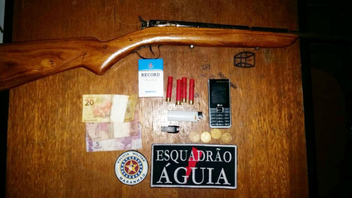 Dois jovens identificados como Claudemir do Santos Neves Aguiar, 20 anos, e Alecsandro Barros Martins, 19 anos, foram presos por porte ilegal de arma, nesse sábado (21), em Porto Franco. Com eles foram encontrados uma espingarda calibre 36, quatro munições intactas, um celular e dinheiro.