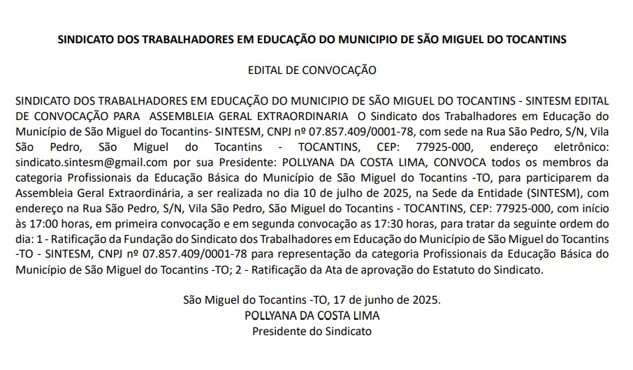 Publicidade Publicidade Geral EDITAL DE CONVOCAÇÃO – SINDICATO DOS TRABALHADORES EM EDUCAÇÃO DO MUNICÍPIO DE SÃO MIGUEL DO TO By Folha do Bico 20 de junho de 2025 0 135 Share WhatsAppPrintTelegramFacebookTwitterCopy URL Folha do Bico Noticias Relacionadas Processo para tirar carteira de motorista fica mais simples, digital e barato em todo o país 9 de dezembro de 2025 Programa Acredita encerra ciclo 2025 com debates sobre crédito, inovação e gestão inteligente 8 de dezembro de 2025 Recorte Automático de Vídeo para uma Edição Multiformato Sem Esforço 5 de dezembro de 2025 Share WhatsAppPrintTelegramFacebookTwitterCopy URL Previous articleAUGUSTINÓPOLIS: Golpe das passagens aéreas falsas derruba quadrilha em operação nacionalNext articleARAGUAÍNA: Acusado de assediar ex com 40 Pixs e mensagens é preso por descumprir medidas protetivas - Advertisement - - Advertisement - Ultimas noticias Obras da Ponte JK estão 95% concluídos 13 de dezembro de 2025 SÃO MIGUEL: Ordem de serviço autoriza conclusão de creche paralisada há mais de uma década 12 de dezembro de 2025 Policial militar do Tocantins é preso após agressão covarde contra idoso flagrada em vídeo 12 de dezembro de 2025 TOCANTINÓPOLIS: Viatura da Polícia Federal é vista na Prefeitura 12 de dezembro de 2025 No Tocantins, jovem de 20 anos hackeia perfil de professora e pede nudes para alunas de 14 anos 12 de dezembro de 2025