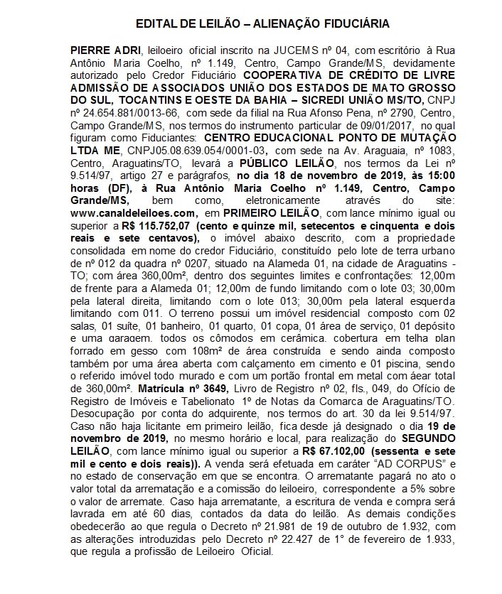 Publicidade Publicidade Geral EDITAL DE LEILÃO – ALIENAÇÃO FIDUCIÁRIA By Folha do Bico 12 de novembro de 2019 0 482 Share WhatsAppPrintTelegramFacebookTwitterCopy URL Folha do Bico Noticias Relacionadas Leon Bet: É o melhor site de apostas para ganhar dinheiro? 2 de janeiro de 2026 Filas de até 9 horas levam Lisboa a suspender sistema digital de imigração 31 de dezembro de 2025 Campanha Janeiro Branco 2026 deve crescer nas empresas e ampliar ações de saúde mental no ambiente corporativo 23 de dezembro de 2025 Share WhatsAppPrintTelegramFacebookTwitterCopy URL Previous articleELDORADO DOS CARAJÁS: Mulher suspeita de tráfico de drogas é presa com crack e cocaínaNext articleARAGUATINS: Veja as vagas de emprego para esta terça, 12 - Advertisement - - Advertisement - Ultimas noticias SÃO BENTO: Droga e dinheiro são encontrados durante abordagem de meliante no bairro São Francisco 15 de janeiro de 2026 ARAGUATINS: Aquiles recua após conflito com DETRAN e apresenta pacote de medidas para o trânsito 15 de janeiro de 2026 Laurez é “despejado” do Palácio Araguaia 15 de janeiro de 2026 IMPERATRIZ: Prefeitura publica decreto com calendário de feriados e pontos facultativos de 2026 15 de janeiro de 2026