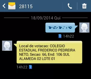 O serviço de SMS já existia nas eleições municipais de 2012, mas ainda era pago. Quem quiser receber a informação pelo celular deve mandar uma mensagem com o número do título eleitoral para 28115. Em seguida ele receberá o local de votação com o endereço e o número da seção eleitoral. O sistema já está disponível e o eleitor já pode realizar a consulta.