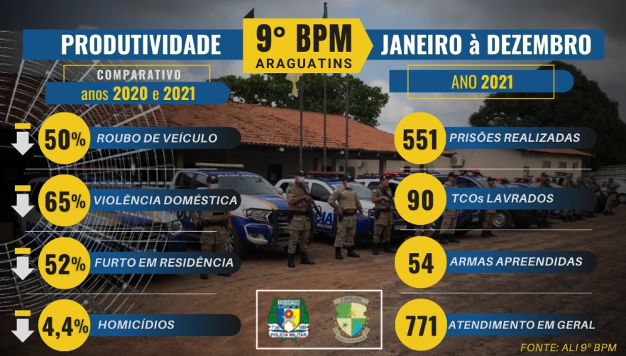 A Polícia Militar por meio do 9º Batalhão (9º BPM) em Araguatins, no Bico do Papagaio, divulgou na manhã desta terça-feira, 11, o balanço de produtividade com o comparativo das ocorrências registradas pela Unidade, nos meses de janeiro a dezembro de 2021, em relação ao mesmo período do ano de 2020.