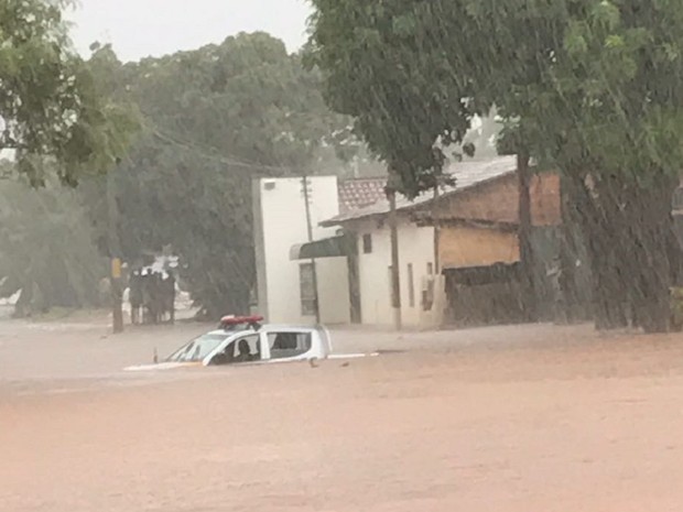 Um carro da Polícia Militar foi coberto por água da chuva em um ponto de alagamento que se formou em Formoso do Araguaia, sul do Tocantins. Segundo a Defesa Civil estadual, choveu cerca de 70 milímetros na cidade na manhã desta quinta-feira (8). Também há registro de pelo menos duas casas alagadas. Segundo moradores, o problema é causado por uma obra inacabada na BR-242.