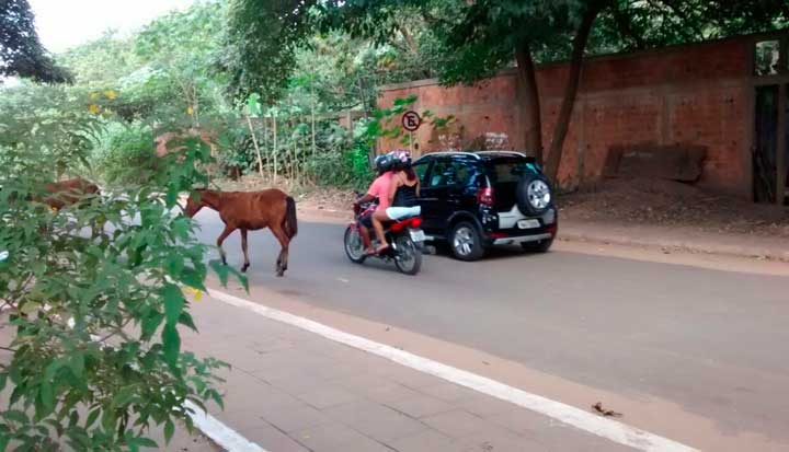 Na manhã deste domingo (7), três cavalos disputavam espaço com motoristas na rua Floriano Peixoto, próximo a uma pracinha, no bairro Nova Imperatriz.