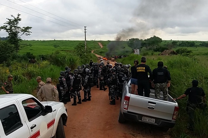 O cumprimento de mandado de reintegração de posse da fazenda Santa Teresa, em Marabá, aconteceu nesta quinta-feira (14), dentro da normalidade. Os ocupantes inicialmente bloquearam a entrada do acampamento e incendiaram pneus e troncos de árvores, mas após a leitura da ordem judicial os líderes da ocupação decidiram sair pacificamente. Não houve necessidade do emprego da força para que a tropa da Polícia Militar entrasse no terreno. O remanejamento das famílias aconteceu de forma pacífica. A previsão é de que a reintegração termine nesta sexta-feira.