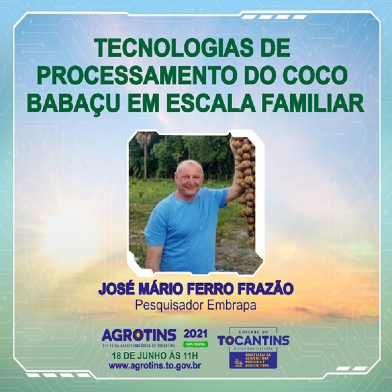 Entre os dias 15 e 18 de junho, acontece mais uma edição da Agrotins, a Feira Agrotecnológica do Tocantins, cujo tema deste ano é “Agro 4.0 – Tecnologia no campo”. É a 21ª edição, que, assim como no ano passado, será totalmente virtual. A Embrapa Cocais é uma das Unidades da Empresa que participa do evento mostrando novidades e resultados de pesquisa. O pesquisador da Embrapa Cocais José Mário Ferro Frazão irá apresentar palestra de tema “Tecnologias de processamento de coco babaçu em escala familiar”, com destaque para ferramenta de quebra do coco, em processo de validação pelas quebradeiras do Maranhão e já com resultados promissores.