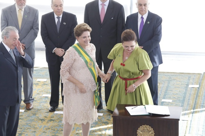 Kátia Abreu foi uma escolha pessoal de Dilma que, posteriormente, foi apadrinhada pela bancada do PMDB do Senado. Prestigiada pela presidente, ela sentou-se na primeira fileira do Salão Nobre, ao lado dos titulares dos Transportes, Antonio Carlos Rodrigues (PR), e da Educação, Cid Gomes (PROS).