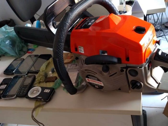 Na casa do receptador, a PM apreendeu 1 motosserra, 6 aparelhos celulares, 2 máquinas fotográficas, 1 balança de precisão, 8 papelotes de substância análoga a maconha, 2 substância análoga a pedras de crack, 2 papelotes de substância análoga a cocaína, além de uma quantia em dinheiro no valore de R$ 461,30.