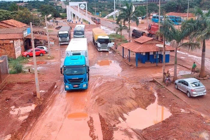 Caminhões e carretas têm dificuldade para passar pela estrada, que está cheia de lama e buracos. Os caminhoneiros dizem que chegar ao posto fiscal, de parada obrigatória, é um desafio e há risco de ficar atolado na lama.