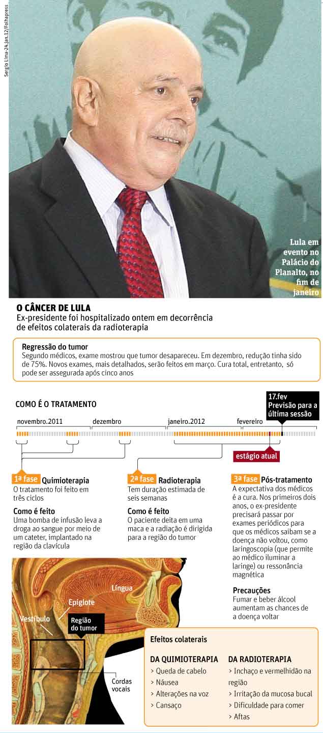 Nos últimos dias, o efeito da radioterapia tem impedido o petista de ir ao seu escritório no Instituto Lula, que fica no bairro do Ipiranga (zona sul de SP). Por recomendação médica, o ex-presidente não vai mais desfilar na escola de samba Gaviões da Fiel, durante o Carnaval, e foi impedido de participar ontem do 32º aniversário do PT, em Brasília.