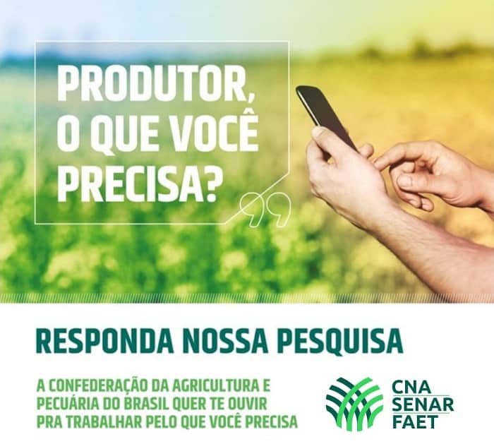 A Confederação Nacional da Agricultura (CNA), e a Federação da Agricultura e Pecuária do Estado do Tocantins (FAET), estão realizando uma pesquisa para ouvir você produtor rural.