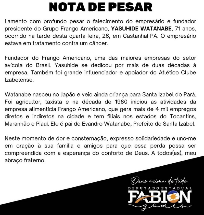 Faleceu na tarde desta quarta-feira, 26, vítima de câncer, aos 71 anos, Yasuhide Watanabe, fundador do Frango Americano, com sede localizada na cidade de Santa Izabel, considerado o maior grupo empresarial do setor avícola do Norte do Brasil, com unidades instaladas nos Estados do Tocantins, Piauí e Maranhão. Watanabe que completaria aniversário em março deste ano, lutava contra a doença e não resistiu aos efeitos provocados. Há 40 anos comandava o Grupo Americano que mantém operações de incubação, criação e abate de aves.