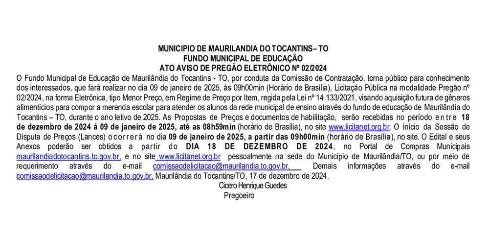 Publicidade Publicidade Geral FUNDO DE EDUCAÇÃO DO MUNICÍPIO DE MAURILÂNDIA-TO – AVISO DE PREGÃO ELETRÔNICO Nº 02/2024 By Folha do Bico 17 de dezembro de 2024 0 23 Share WhatsAppPrintTelegramFacebookTwitterCopy URL Folha do Bico Noticias Relacionadas PREFEITURA DE MAURILÂNDIA DO TO – ATO AVISO DE CONCORRÊNCIA ELETRÔNICA Nº 06/2025 – REPUBLICAÇÃO 2 de dezembro de 2025 PREFEITURA DE MAURILÂNDIA DO TO – ATO AVISO DE CONCORRÊNCIA ELETRÔNICA Nº 05/2025 – REPUBLICAÇÃO 2 de dezembro de 2025 PREFEITURA DE MAURILÂNDIA DO TO – ATO AVISO DE CONCORRÊNCIA ELETRÔNICA Nº 04/2025 – REPUBLICAÇÃO 2 de dezembro de 2025 Share WhatsAppPrintTelegramFacebookTwitterCopy URL Previous articleFUNDO DE EDUCAÇÃO DO MUNICÍPIO DE MAURILÂNDIA-TO – AVISO DO PREGÃO PRESENCIAL Nº 02/2024Next articlePREFEITURA MUNICIPAL DE AXIXÁ DO TO – AVISO DE LICITAÇÃO - Advertisement - - Advertisement - Ultimas noticias AUGUSTINÓPOLIS: Vigilante de abrigo é preso suspeito de abusar duas crianças 4 de dezembro de 2025 SÃO MIGUEL: Lixão é fechado e passa a ter acesso controlado sob novas diretrizes ambientais 4 de dezembro de 2025 ARAGUATINS: Insatisfeitos, Abmael, Chico Moura e Rafael Oliveira passam a votar com a oposição e complicam gestão Aquiles 4 de dezembro de 2025 ARAGUATINS: Com voto decisivo e comando da oposição, Airton se torna principal contraponto à gestão Aquiles 4 de dezembro de 2025