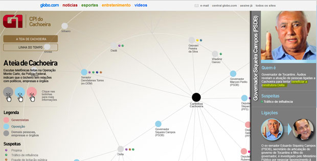 Quando internauta clica na bolinha azul, acima do nome de Siqueira, o infográfico abre uma tela à direita com os dados do governador do Tocantins e a informação de que seu envolvimento com Cachoeira é por suspeita de “tráfico de influência”.