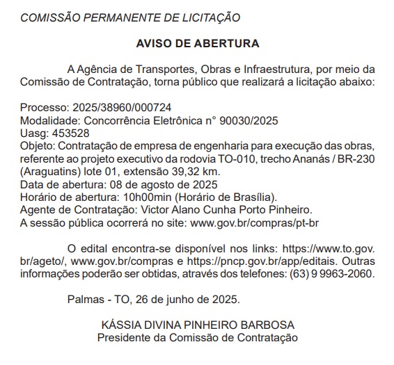 O edital completo está disponível nos portais da AGETO, do Governo Federal e no Portal Nacional de Contratações Públicas (PNCP). Informações adicionais podem ser obtidas pelo telefone (63) 9 9963-2060.