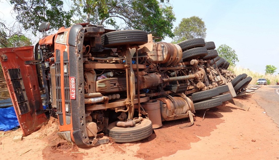 De acordo com informações de testemunhas, uma carreta-bitrem carregada de madeira tombou e o passageiro ainda não identificado morreu no local do acidente.