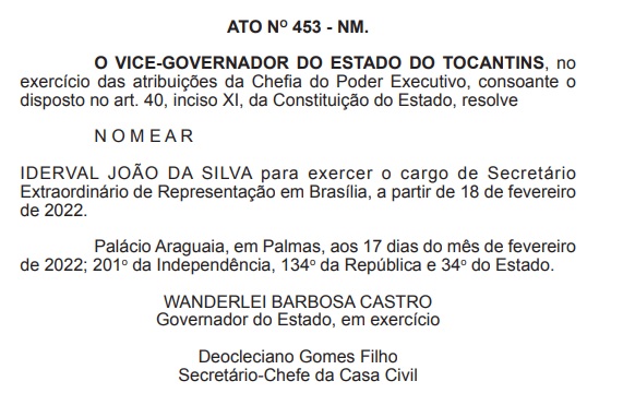 Ex-deputado estadual por quatro mandatos, Iderval Silva, foi nomeado pelo governador em exercício, Wanderlei Barbosa, como como secretário extraordinário de Representação em Brasília.