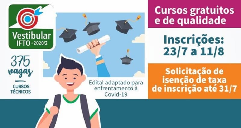 O Instituto Federal do Tocantins (IFTO) oferta 375 vagas para cursos técnicos gratuitos, distribuídas nas seguintes unidades: Araguaína, Gurupi, Lagoa da Confusão, Palmas e Pedro Afonso. As inscrições devem ser feitas por meio do Portal Seja IFTO, do dia 23 de julho até o dia 11 de agosto. Neste certame, o valor da inscrição é de R$ 15,00.
