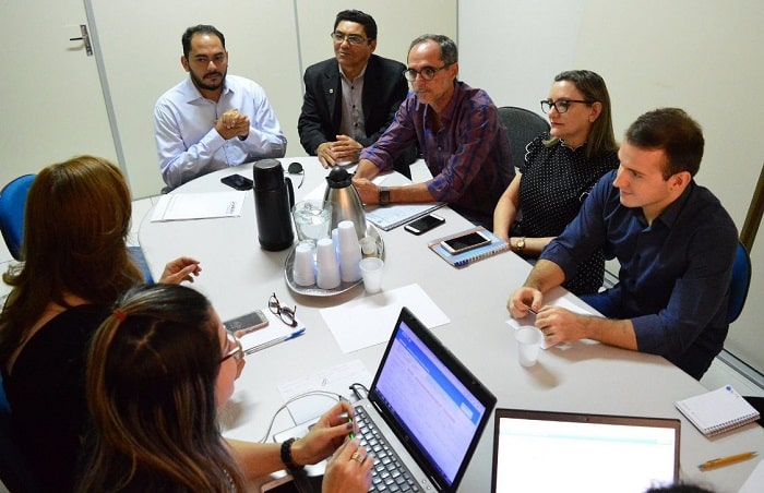 Prefeito Assis Ramos, acompanhado dos secretários Francisco Pinheiro, da Infraestrutura, e Rosa Arruda, do Meio Ambiente; vereador Pedro Gomes (PSC), técnicos e engenheiros, participou na manhã desta quarta-feira, 20, de reunião com a gerente da Caixa Econômica Federal, Mara Nolasco, e demais diretores, que alinhou ações das obras de construção do aterro sanitário e do Programa de Aceleração do Crescimento, PAC-2.