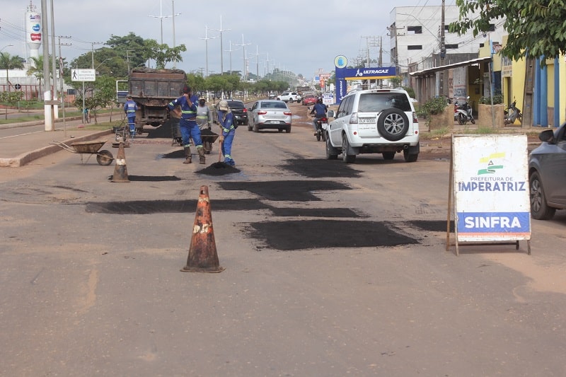 Mais duas frentes de trabalho aceleram nesta quarta-feira, 27 de maio, a recuperação da malha asfáltica de ruas e avenidas danificadas pelas fortes chuvas em Imperatriz: Avenidas Babaçulândia, em frente ao novo supermercado Mateus, Vila Lobão, e na Pedro Neiva de Santana, na altura da rotatória de acesso ao Parque Sanharol.