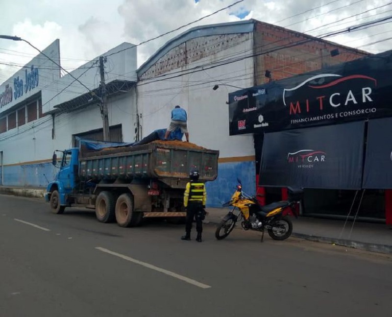 Em patrulhamento pela Rua Luís Domingues, setor Mercadinho, o agente de trânsito Frank Gomes flagrou o transporte de barro em uma caçamba que, embora tivesse a lona proteção, não estava utilizando cobertura para evitar fragmentos da carga na via pública. “Temos orientado os condutores quanto ao cumprimento da legislação de trânsito e ambiental que versa sobre a exigência da utilização da lona de proteção”, explicou.