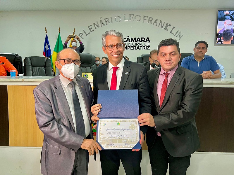 Através do Decreto Legislativo nº 53/2022, de autoria dos vereadores João Silva (MDB) e Alberto Sousa (PDT), a solenidade aconteceu na Câmara Municipal, reunindo autoridades dos diversos setores e a imprensa. Além de populares, a Casa de Leis recebeu lideranças comunitárias e empresariais, entre as quais Guilherme Maia Rocha, presidente da Aliança Empresarial; e João Borges Lira, presidente da Associação Comercial e Industrial de Imperatriz (ACII), Alessandra Belfort, procuradora-geral de Imperatriz; Paulo Velten, governador em exercício; Sebastião Madeira, chefe da Casa Civil do Estado; e o deputado estadual Zé Inácio. “Para mim, é uma honra muito especial estar aqui recebendo este título por indicação do presidente Alberto Sousa. Aqui, represento, também, o Poder Judiciário, na condição de presidente licenciado para estar no exercício do Governo. Quero agradecer por esse honroso título que recebo e a toda a Câmara de Vereadores de Imperatriz”, afirmou o governador interino Paulo Velten. (ASCOM CMITZ)