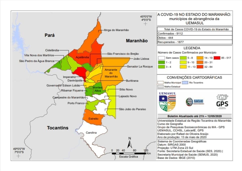O Laboratório de Cartografia e Geoprocessamento, do curso de Geografia da UEMASUL produz diariamente mapas que mostram a evolução da COVID-19, com a distribuição geográfica e o raio de concentração dos casos confirmados em Imperatriz e região, e em todo o Estado. Os mapas, que mostram os locais afetados pela doença causada pelo novo coronavírus, são construídos de acordo com dados divulgados pela secretaria de estado da Saúde e secretaria municipal de Saúde.