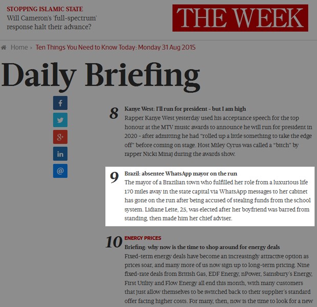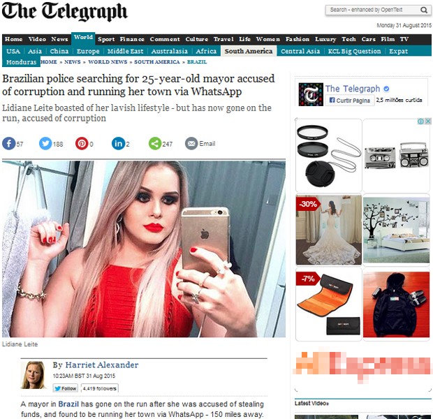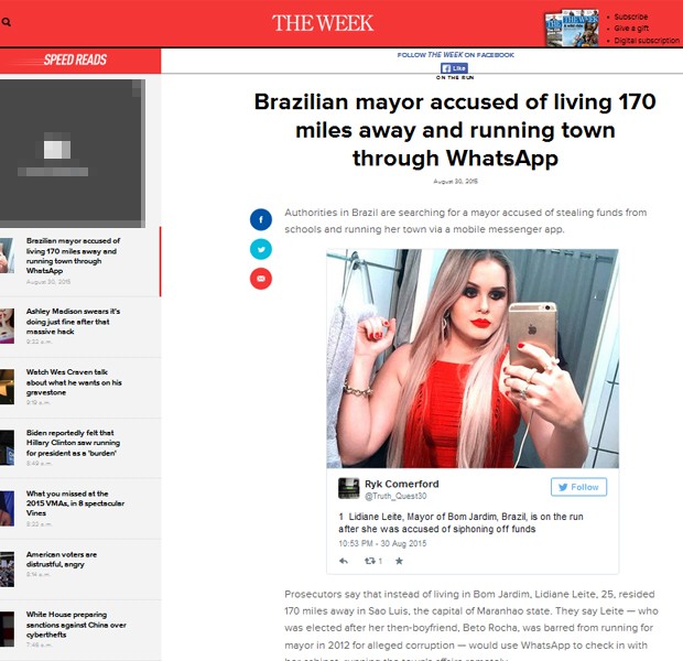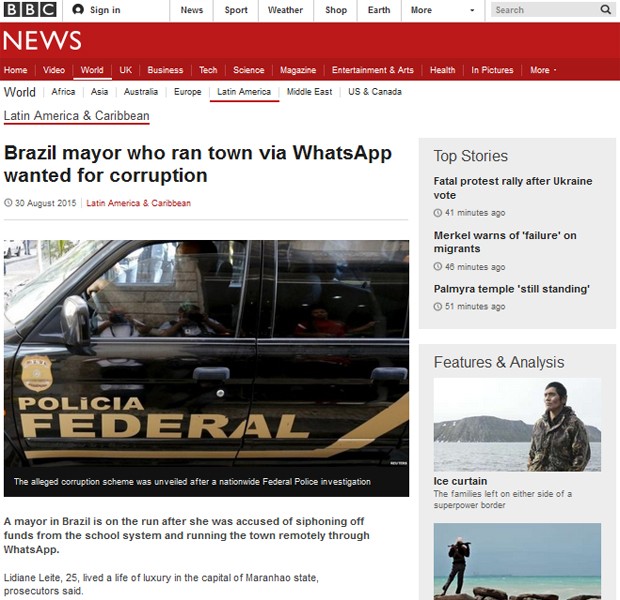 “Uma prefeita no Brasil está foragida após ter sido acusada por desviar fundos do sistema escolar e comandar a cidade remotamente, por meio do WhatsApp. Lidiane Leite, 25, vivia uma vida de luxo na capital do Estado do Maranhão, disseram os promotores. Eles dizem que seu único contato com sua cidade, Bom Jardim, foi através de mensagens diárias WhatsApp para o seu gabinete”, informa trecho inicial do texto.