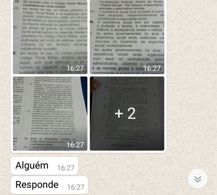 Junto com os arquivos, também tem sido compartilhado uma possível cópia do registro da ocorrência, na qual relata que “após verificação foi localizado nos registros do aparelho uma mensagem SMS com o Título “Prova 3”, tendo em seu conteúdo com gabarito alfanumérico de 01 a 60”.