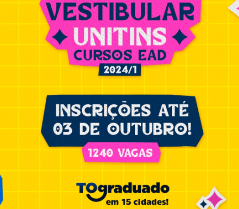Encerram-se na próxima terça-feira, 3 de outubro, as inscrições do Vestibular 2024/1 para os cursos de Educação a Distância (EaD) do Projeto de Interiorização Universitária, TO Graduado, da Universidade Estadual do Tocantins. Neste certame, foram ofertadas 1.240 vagas distribuídas em 15 municípios do Estado. Do total de vagas ofertadas, 50% são destinadas a estudantes de escolas públicas, pretos e pardos, indígenas e pessoas com deficiência (PcD).