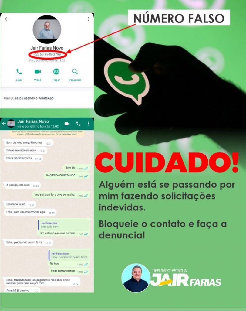 O deputado estadual, Jair Farias (UNIÃO), foi alvo de criminosos de golpes via WhatsApp. Os estelionatários usando o aplicativo, tentaram se passar pelo parlamentar, pedindo uma transferência de pix, alegando que estourou o limite e devolveria o dinheiro no outro dia.