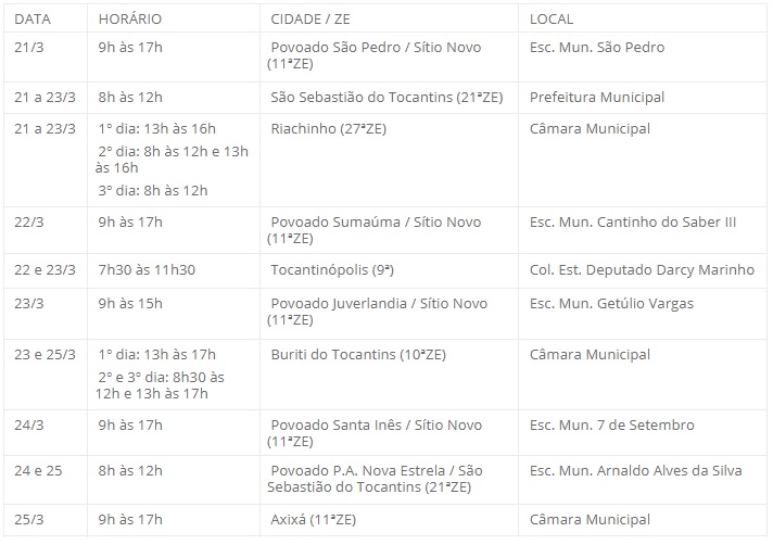 Entre os dias 21 e 25 de março, a Justiça Eleitoral do Tocantins leva os serviços cartorários de forma itinerante a mais 6 municípios do Bico do Papagaio esta semana. Para votar nas Eleições Gerais em 2 de outubro, termina em 4 de maio o prazo de cadastramento eleitoral para realização de alistamento eleitoral (1º título), revisão, transferência e regularização do título.