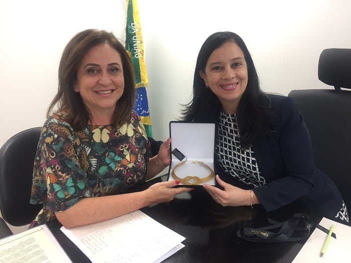 Kátia Abreu presenteou a advogada-geral com um colar de capim-dourado, artesanato típico da região do Jalapão, no Tocantins. Grace Maria fará aniversário no próximo dia 17.