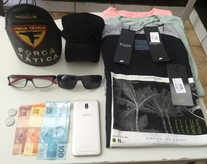 A equipe de policiais militares realizava patrulhamento quando deparou com o suspeito transportando 4 camisetas, 1 boné e 1 par de óculos, furtados no comércio de Araguatins e 1 aparelho celular subtraído de uma loja no centro de Augustinópolis.