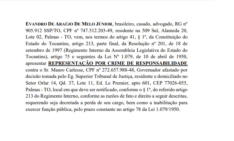 Clique AQUI leia a representação por crime de responsabilidade, acatada pelo presidente da Assembleia Legislativa, deputado estadual Antônio Andrade (PSL), nesta terça-feira, 7, feita pelo advogado Evandro de Araújo de Melo Júnior, que culminou na abertura de impeachment, contra o governador afastado, Mauro Carlesse (PSL).