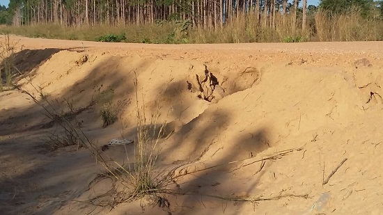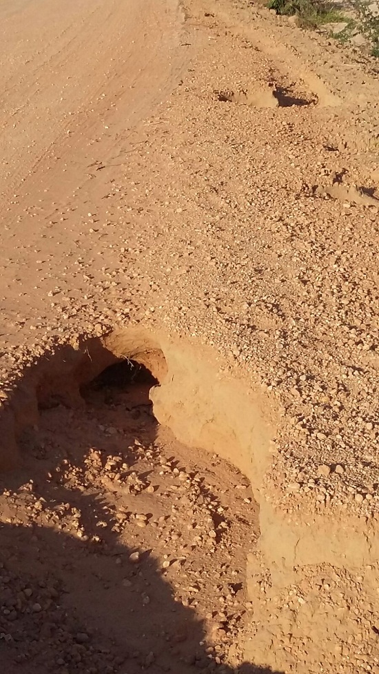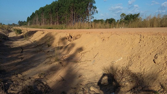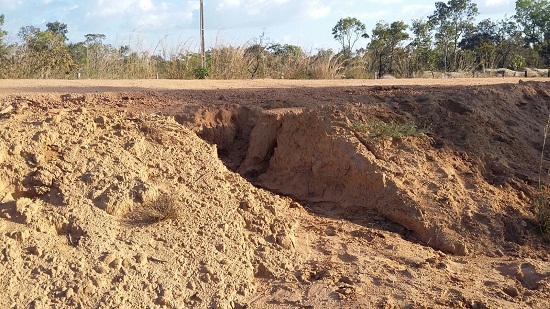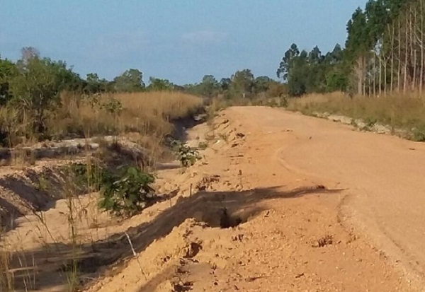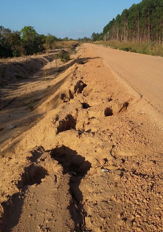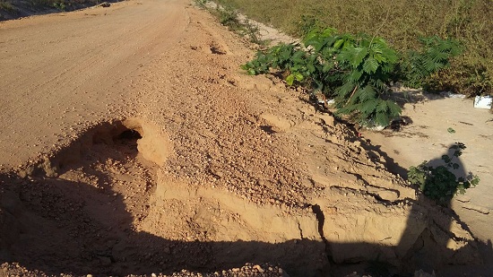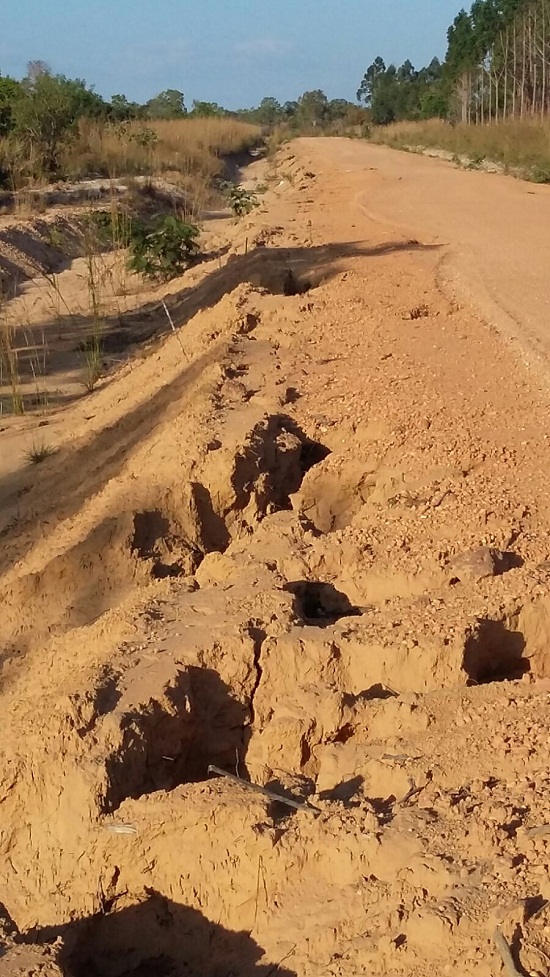 A erosão tem destruído diariamente o aterro, que também vem abrindo diversos buracos profundos no meio da rodovia, causando perigos de acidente na via.