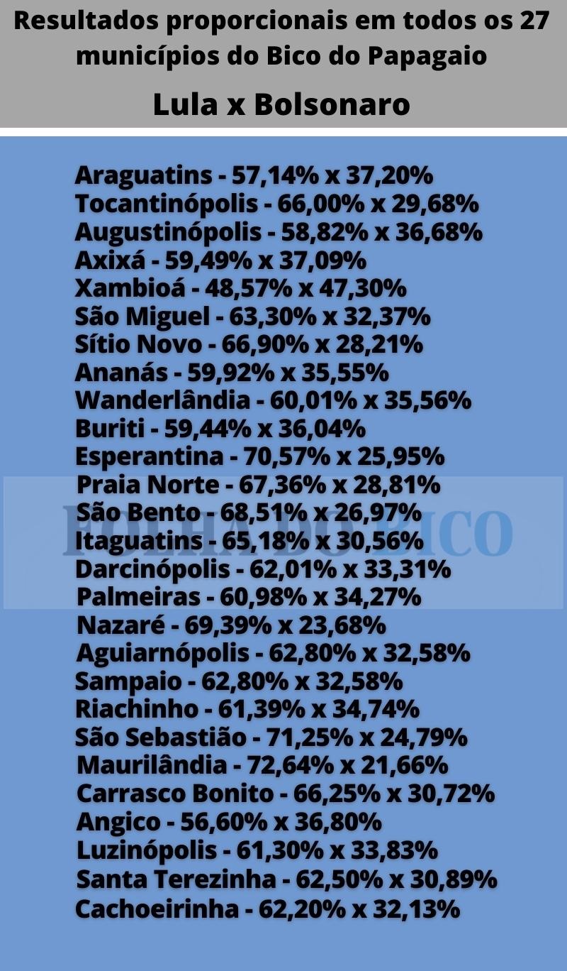 O resultado da eleição para presidente da República neste 1ª turno, que ocorreu no último domingo, 2, trouxe a vitória do candidato do PT, Lula, em todos os municípios do Bico do Papagaio.