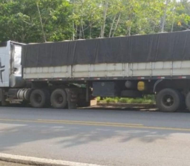 Durante fiscalização, no km 75 da rodovia Transamazônica (BR-230), foi dada ordem de parada a um caminhão Volvo/Fh12, de cor branca, que estava atrelado a um semi reboque Sr/Randon Sr Ca, de cor azul. Após a fiscalização no conjunto veicular, observou-se que a carga transportada era de madeira nativa na forma serrada, sendo iniciada a inspeção da carga.