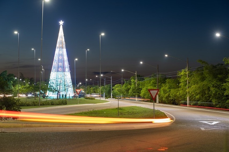 Inaugurada na semana passada, com previsão de funcionamento até o fim do mês, as noites marabaenses estão mais iluminadas na entrada da Marabá Pioneira. As luzes da árvore de natal foram acesas pela Prefeitura de Marabá e a árvore já virou a principal atração natalina da cidade. Quem passa pelo local não resiste em registrar o monumento de 30 metros de altura decorado com luzes coloridas. São mais de 4 mil metros de iluminação de led, que esse ano traz de novidade a fita vermelha e a estrela do topo com detalhes em azul.