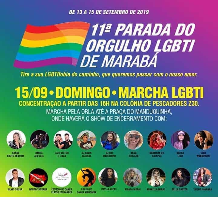 A 11ª edição da Parada do Orgulho LGBTI (lésbicas, gays, bissexuais, transgêneros e intersex) de Marabá, na região de Carajás, no estado do Pará, será realizada neste domingo, 15, com concentração a partir das 14h em frente a Colônia de Pescadores Z30, na Avenida Marechal Deodoro, Cidade Pioneira.