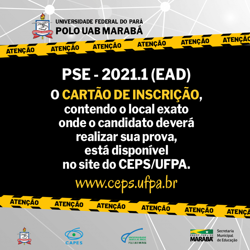 A Universidade Federal do Pará (UFPA) torna pública a reabertura dos procedimentos referentes ao primeiro Processo Seletivo Especial de 2021 (PSE 2021-1) destinado ao ingresso de discentes nos cursos de graduação da UFPA na modalidade de Educação a Distância. O processo seletivo teve suas atividades suspensas em virtude das restrições estabelecidas para atividades presenciais na Universidade, a partir da adoção da Bandeira Laranja, em todos os campi, na data de 28 de janeiro, conforme orientação do Grupo de Trabalho da UFPA sobre o Novo Coronavírus. A retomada do novo cronograma iniciará com a aplicação da prova de Conhecimentos Gerais, que ocorrerá em 27 de junho de 2021 (domingo), no horário das 14h às 18h30, respeitando todas as medidas de segurança sanitária exigidas pela OMS, bem como, acatando as orientações do Grupo de Trabalho da UFPA.