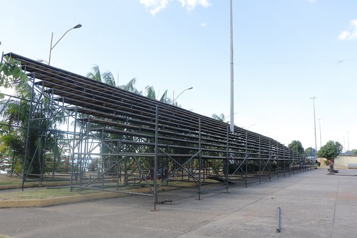 A batida de martelos é comum na movimentação que tem sido intensa no complexo poliesportivo do Bairro Santa Rosa nos últimos dias. É que equipes da Secretaria de Obras (SEVOP) estão trabalhando para deixar a estrutura do Arraial Municipal, toda pronta, para a decoração do espaço que deve ser finalizada até a próxima sexta-feira.