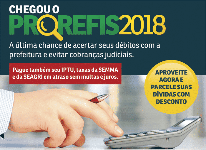 Mesmo procedimento está aberto aos contribuintes do IPTU que não quitaram dívidas de anos anteriores, cujo débito foi anexado em página amarela ao carnê do IPTU/2018, com vencimento em 30 de agosto. Tem até 14 de setembro, para emissão de um novo DAM – Documento de Arrecadação Municipal – com vencimento em 28 de setembro/2018 e ainda a possibilidade de parcelamento, seguindo o que estabelece a Lei do Prorefis.