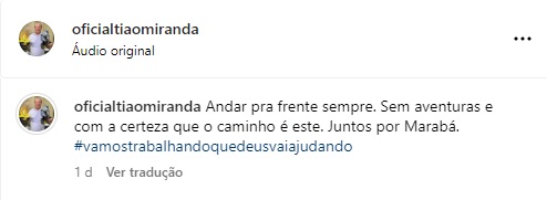 Em um apostagem em suas redes sociais, ele abriu o domingo, 24, escrevendo, “Andar pra frente sempre. Sem aventuras e com a certeza que o caminho é este. Juntos por Marabá.