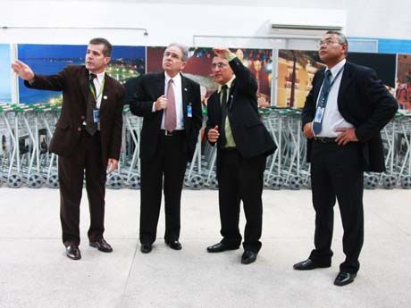 “O Maranhão merece um aeroporto que atenda melhor a demanda existente hoje. A Infraero está empenhada em garantir isso o mais breve possível”: a afirmação foi feita, nesta segunda-feira, 8, pelo presidente da Empresa Brasileira de Infraestrutura Aeroportuária (Infraero), Antônio Gustavo Matos do Vale, após inspeção realizada no aeroporto de São Luís, Marechal Cunha Machado, onde conheceu as instalações provisórias. Gustavo do Vale verificou o andamento das obras de recuperação da pista 6/24, já iniciadas, e vistoriou o terminal interditado, ao lado dos superintendentes da Regional Norte, Paulo Roberto Pereira da Costa, e do aeroporto, Hildebrando Coelho.