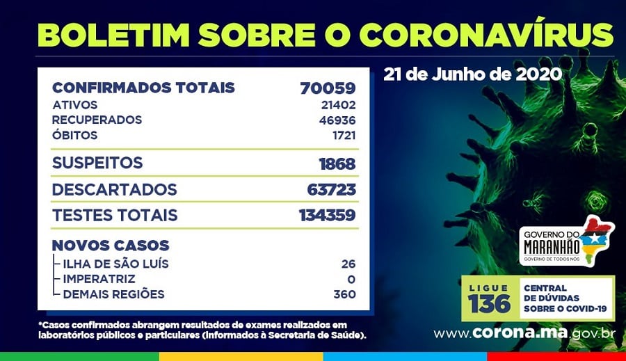 De acordo com a SES, desde o início do monitoramento, o Maranhão já realizou 134.359 testes para Covid-19. Mais de 1,8 mil pacientes seguem com o diagnóstico sob suspeita e 63.723 foram descartados.
