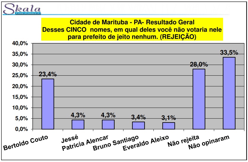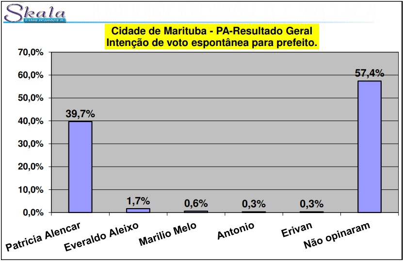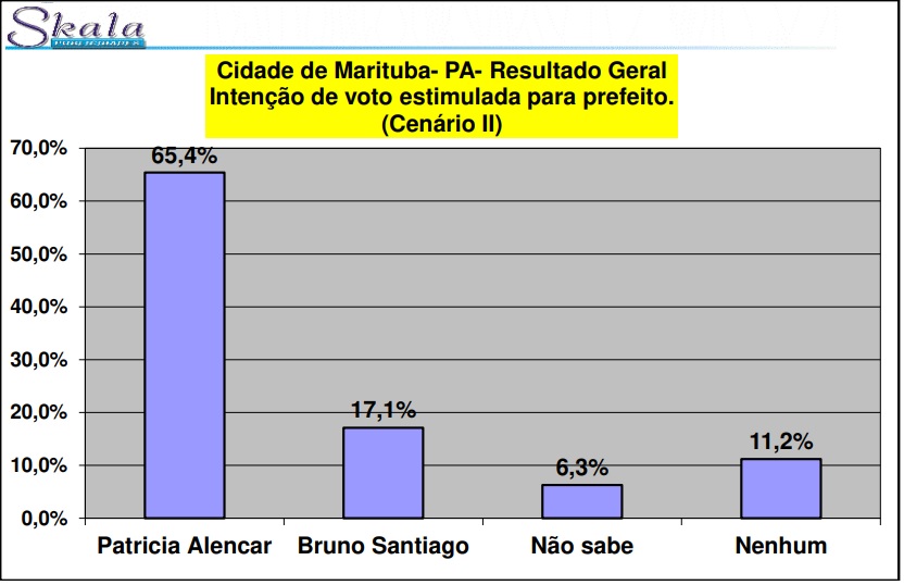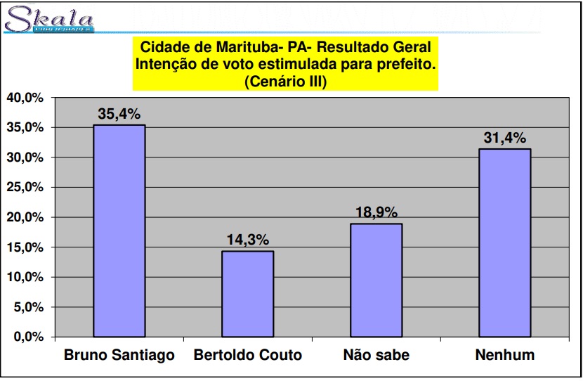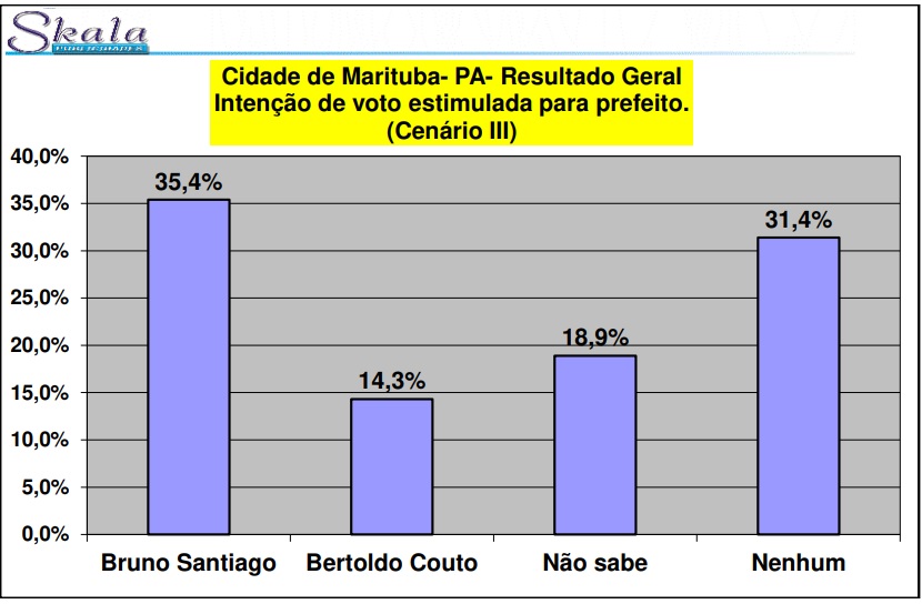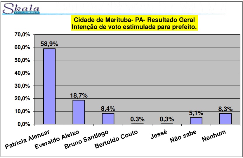 Em Marituba um município localizado na Região Metropolitana de Belém com certa de 110 mil habitantes, o Instituto Skala fez uma recente pesquisa que mediu a intenção de votos para prefeito. Foram ouvidos 410 eleitores, nos dias 23,24 e 25 de junho de 2.023. O levantamento apresenta grau de confiabilidade de 95% de acerto e pode ter até 3,5% de margem de erro para mais ou para menos.