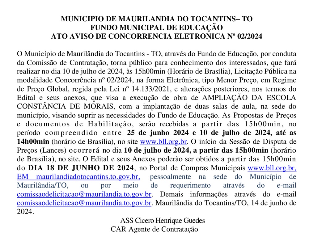 Publicidade Publicidade Geral MAURILÂNDIA DO TOCANTINS – FUNDO MUNICIPAL DE EDUCAÇÃO – AVISO DE CONCORRÊNCIA ELETRÔNICA Nº 02/2024 By Folha do Bico 17 de junho de 2024 0 60 Share WhatsAppPrintTelegramFacebookTwitterCopy URL Folha do Bico Noticias Relacionadas Recorte Automático de Vídeo para uma Edição Multiformato Sem Esforço 5 de dezembro de 2025 PREFEITURA DE MAURILÂNDIA DO TO – ATO AVISO DE CONCORRÊNCIA ELETRÔNICA Nº 06/2025 – REPUBLICAÇÃO 2 de dezembro de 2025 PREFEITURA DE MAURILÂNDIA DO TO – ATO AVISO DE CONCORRÊNCIA ELETRÔNICA Nº 05/2025 – REPUBLICAÇÃO 2 de dezembro de 2025 Share WhatsAppPrintTelegramFacebookTwitterCopy URL Previous articleXAMBIOÁ: UB e PSDB fecham apoio à pré-candidatura de Mayck CâmaraNext articleMAURILÂNDIA DO TOCANTINS – PREFEITURA MUNICIPAL – ATO AVISO DE PREGÃO ELETRÔNICO Nº 01/2024 - Advertisement - - Advertisement - Ultimas noticias STF derruba afastamento de Wanderlei Barbosa e governador reassume mandato 5 de dezembro de 2025 AUGUSTINÓPOLIS: Acender das Luzes celebra 4ª edição da Magia do Natal com espetáculo especial nesta sexta-feira 5 de dezembro de 2025 44 mil famílias sem casa. Enquanto isso, a política do Tocantins segue repetindo promessas que nunca saem do papel 5 de dezembro de 2025 AUGUSTINÓPOLIS: Comunidade celebra a chegada do período natalino com cores, música e emoção 5 de dezembro de 2025