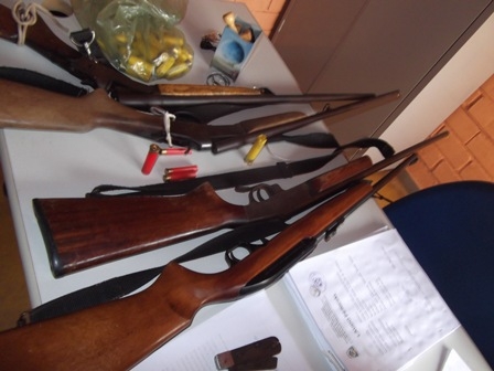 Durante as buscas, foram encontradas quatro armas de fogo com os criminosos, sendo elas uma espingarda cartucheira calibre 20 de fabricação caseira com 24 cartuchos intactos e 02 deflagrados, uma espingarda cartucheira cal 28 GA modelo 199.2 nº FBE03185 com um cartucho intacto, uma espingarda cartucheira Rossi cal 32 nº S796008, uma espingarda carabina CBC Magnetch cal 22 nº NIE3024018 e três cartuchos calibre 36, ambas em perfeito estado de conservação.