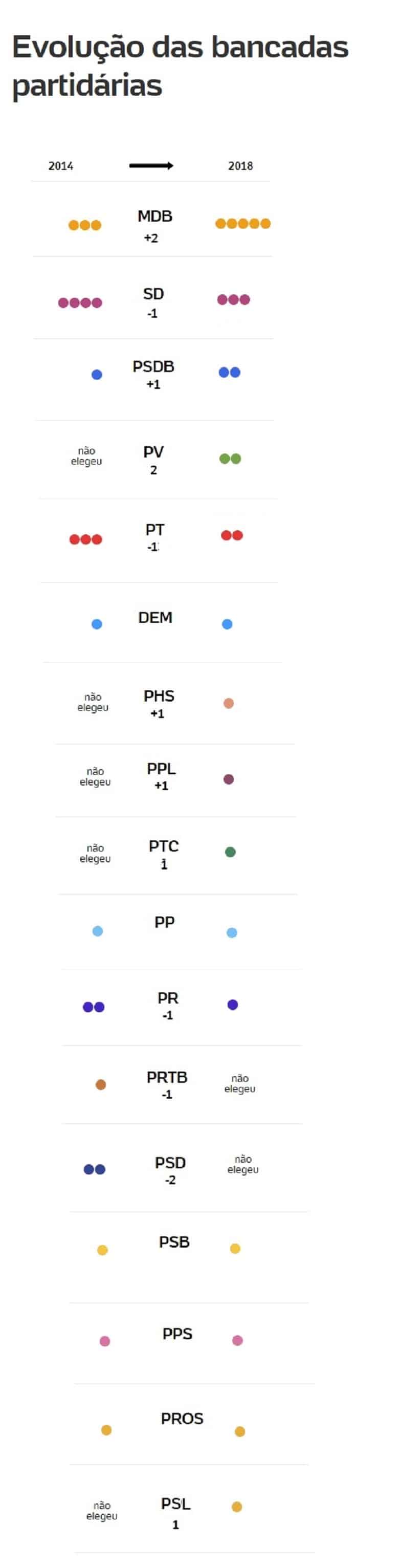 O SD, que em 2014 elegeu 4 deputados estaduais, continua com uma grande bancada, mas perdeu representação, ficando com 3 deputados. O MDB saltou de 3 em 2014 para 5 este ano.