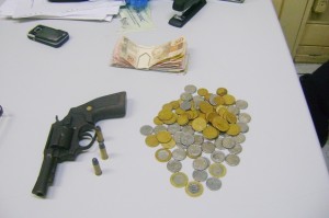 Com eles, os policiais apreenderam um revólver calibre 38, três munições e R$ 242,95 em espécie.